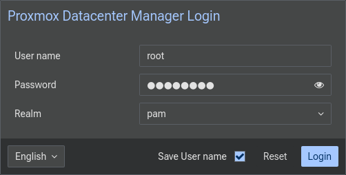 When you connect to the web interface, you will first see the login window. Proxmox Datacenter Manager supports various languages and authentication back ends (Realms), both of which can be selected here.